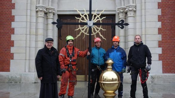 6. W transepcie kościoła można zobaczyć nowe krzyże, które zwieńczą sygnaturkę i północną wieżę kościoła wraz z odnowionymi kulami. Został również zdjęty stary krzyż z południowej wieży, która mocno ucierpiała w wyniku działań wojennych. Z dołu tego nie widać, ale ostatni segment wieży jest przestrzelony pociskiem artyleryjskim i poważnie uszkodzone jest poszycie blachy. Można powiedzieć, że to był już ostatni moment na podjęcie prac konserwatorskich.